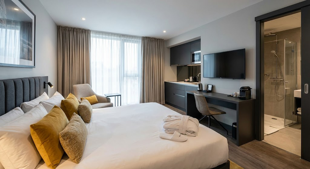 Studio supérieur climatisé de 20-25 m² alliant confort premium, kitchenette équipée et salle d’eau privée pour un séjour d’exception.